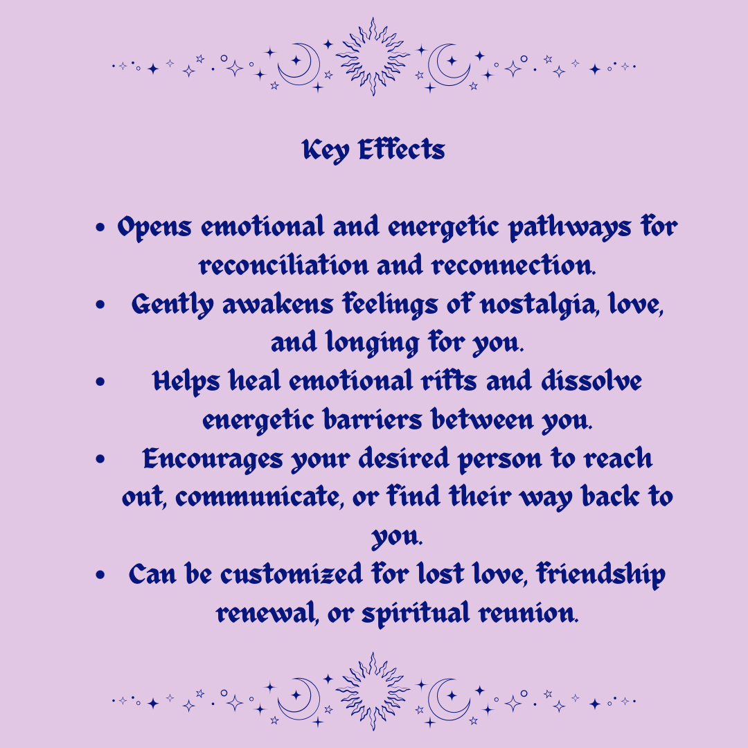 - Can be customized for lost love, friendship renewal, or spiritual reunion.